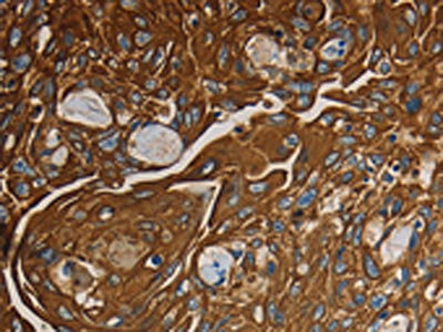 The image on the left is immunohistochemistry of paraffin-embedded Human esophagus cancer tissue using CSB-PA904747(NRP1 Antibody) at dilution 1/25, on the right is treated with fusion protein. (Original magnification: ×200)