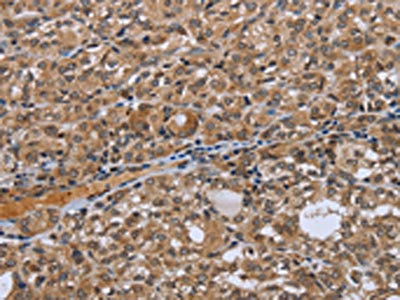 The image on the left is immunohistochemistry of paraffin-embedded Human thyroid cancer tissue using CSB-PA563181(NRP2 Antibody) at dilution 1/35, on the right is treated with synthetic peptide. (Original magnification: ×200)