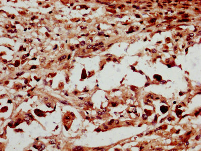 IHC image of CSB-PA836260LA01HU diluted at 1:600 and staining in paraffin-embedded human melanoma performed on a Leica BondTM system. After dewaxing and hydration, antigen retrieval was mediated by high pressure in a citrate buffer (pH 6.0). Section was blocked with 10% normal goat serum 30min at RT. Then primary antibody (1% BSA) was incubated at 4°C overnight. The primary is detected by a biotinylated secondary antibody and visualized using an HRP conjugated SP system.