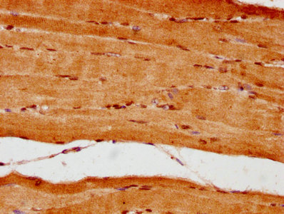 IHC image of CSB-PA016204LA01HU diluted at 1:300 and staining in paraffin-embedded human skeletal muscle tissue performed on a Leica BondTM system. After dewaxing and hydration, antigen retrieval was mediated by high pressure in a citrate buffer (pH 6.0). Section was blocked with 10% normal goat serum 30min at RT. Then primary antibody (1% BSA) was incubated at 4°C overnight. The primary is detected by a biotinylated secondary antibody and visualized using an HRP conjugated SP system.