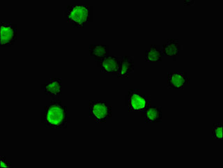 Immunofluorescent analysis of MCF-7 cells using CSB-PA874821LA01HU at dilution of 1:100 and Alexa Fluor 488-congugated AffiniPure Goat Anti-Rabbit IgG(H+L)