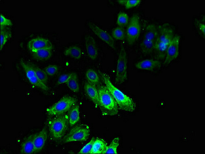 Immunofluorescent analysis of HepG2 cells using CSB-PA00535A0Rb at dilution of 1:100 and Alexa Fluor 488-congugated AffiniPure Goat Anti-Rabbit IgG(H+L)