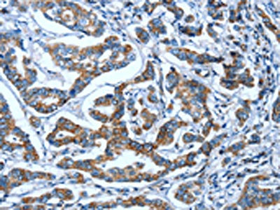 The image on the left is immunohistochemistry of paraffin-embedded Human breast cancer tissue using CSB-PA190109(OPRD1 Antibody) at dilution 1/15, on the right is treated with synthetic peptide. (Original magnification: ×200)