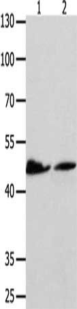 Gel: 10%SDS-PAGE, Lysate: 40 μg, Lane 1-2: Hela cells, 293T cells, Primary antibody: CSB-PA582272(P2RY11 Antibody) at dilution 1/500, Secondary antibody: Goat anti rabbit IgG at 1/8000 dilution, Exposure time: 1 minute