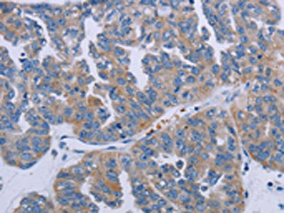 The image on the left is immunohistochemistry of paraffin-embedded Human ovarian cancer tissue using CSB-PA972644(P2RY2 Antibody) at dilution 1/40, on the right is treated with synthetic peptide. (Original magnification: ×200)