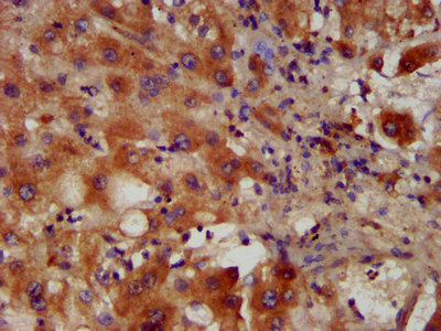 IHC image of CSB-PA017372LA01HU diluted at 1:400 and staining in paraffin-embedded human liver tissue performed on a Leica BondTM system. After dewaxing and hydration, antigen retrieval was mediated by high pressure in a citrate buffer (pH 6.0). Section was blocked with 10% normal goat serum 30min at RT. Then primary antibody (1% BSA) was incubated at 4°C overnight. The primary is detected by a biotinylated secondary antibody and visualized using an HRP conjugated SP system.