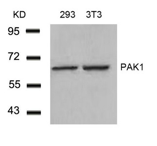 Western blot analysis of extracts from 293 and 3T3 cells using PAK1(Ab-212) Antibody.