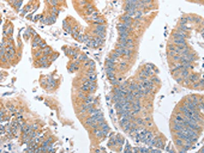 The image on the left is immunohistochemistry of paraffin-embedded Human colon cancer tissue using CSB-PA530130(PARD6A Antibody) at dilution 1/60, on the right is treated with fusion protein. (Original magnification: ×200)