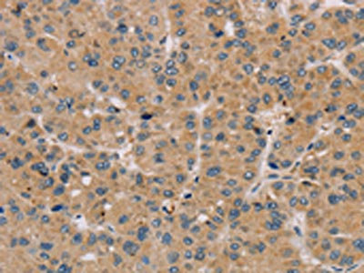 The image on the left is immunohistochemistry of paraffin-embedded Human liver cancer tissue using CSB-PA148428(PARP3 Antibody) at dilution 1/25, on the right is treated with fusion protein. (Original magnification: ×200)