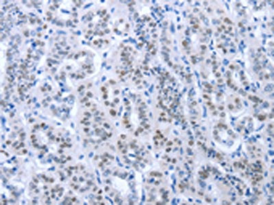 The image on the left is immunohistochemistry of paraffin-embedded Human thyroid cancer tissue using CSB-PA919764(PAX8 Antibody) at dilution 1/35, on the right is treated with fusion protein. (Original magnification: ×200)