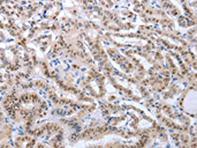 The image on the left is immunohistochemistry of paraffin-embedded Human thyroid cancer tissue using CSB-PA213924(PAX8 Antibody) at dilution 1/25, on the right is treated with fusion protein. (Original magnification: ×200)