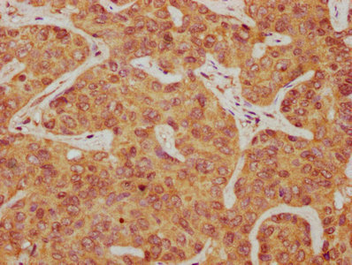 IHC image of CSB-PA017536LA01HU diluted at 1:300 and staining in paraffin-embedded human liver cancer performed on a Leica BondTM system. After dewaxing and hydration, antigen retrieval was mediated by high pressure in a citrate buffer (pH 6.0). Section was blocked with 10% normal goat serum 30min at RT. Then primary antibody (1% BSA) was incubated at 4°C overnight. The primary is detected by a biotinylated secondary antibody and visualized using an HRP conjugated SP system.