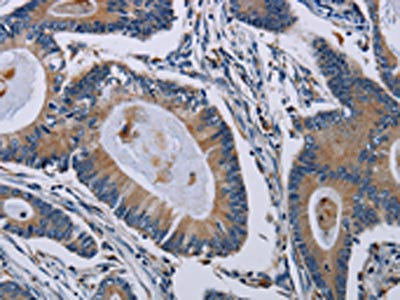 The image on the left is immunohistochemistry of paraffin-embedded Human colon cancer tissue using CSB-PA169703(PCDHAC1 Antibody) at dilution 1/50, on the right is treated with synthetic peptide. (Original magnification: ×200)