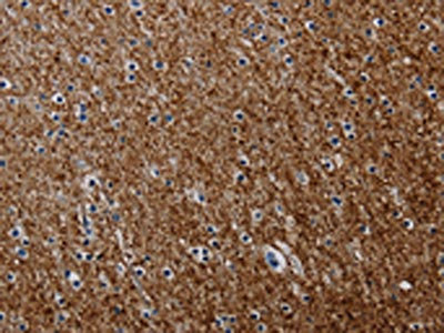 The image on the left is immunohistochemistry of paraffin-embedded Human brain tissue using CSB-PA169703(PCDHAC1 Antibody) at dilution 1/50, on the right is treated with synthetic peptide. (Original magnification: ×200)
