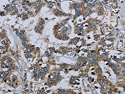 The image on the left is immunohistochemistry of paraffin-embedded Human liver cancer tissue using CSB-PA961839(PCK2 Antibody) at dilution 1/60, on the right is treated with fusion protein. (Original magnification: ×200)