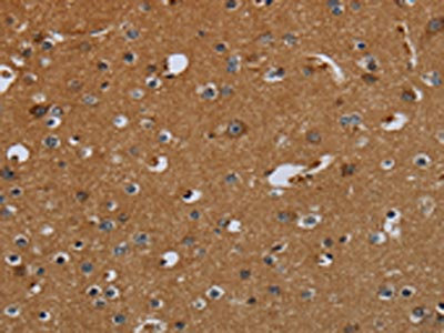 The image on the left is immunohistochemistry of paraffin-embedded Human brain tissue using CSB-PA961839(PCK2 Antibody) at dilution 1/60, on the right is treated with fusion protein. (Original magnification: ×200)