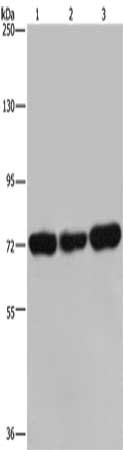Gel: 6%SDS-PAGE, Lysate: 40 μg, Lane 1-3: 293T cells, Jurkat cells, Hela cells, Primary antibody: CSB-PA961839(PCK2 Antibody) at dilution 1/600, Secondary antibody: Goat anti rabbit IgG at 1/8000 dilution, Exposure time: 10 minutes