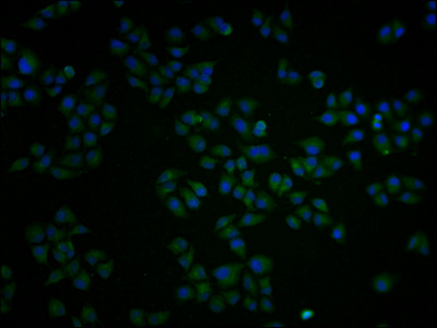 Immunofluorescence staining of Hela cells with CSB-PA017627LA01HU at 1:100, counter-stained with DAPI. The cells were fixed in 4% formaldehyde and blocked in 10% normal Goat Serum. The cells were then incubated with the antibody overnight at 4°C. The secondary antibody was Alexa Fluor 488-congugated AffiniPure Goat Anti-Rabbit IgG(H+L).