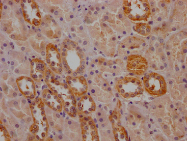 IHC image of CSB-PA017627LA01HU diluted at 1:200 and staining in paraffin-embedded human kidney tissue performed on a Leica BondTM system. After dewaxing and hydration, antigen retrieval was mediated by high pressure in a citrate buffer (pH 6.0). Section was blocked with 10% normal goat serum 30min at RT. Then primary antibody (1% BSA) was incubated at 4°C overnight. The primary is detected by a Goat anti-rabbit polymer IgG labeled by HRP and visualized using 0.05% DAB.