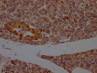 IHC image of CSB-PA017627LA11HU diluted at 1:200 and staining in paraffin-embedded human pancreatic tissue performed on a Leica BondTM system. After dewaxing and hydration, antigen retrieval was mediated by high pressure in a citrate buffer (pH 6.0). Section was blocked with 10% normal goat serum 30min at RT. Then primary antibody (1% BSA) was incubated at 4°C overnight. The primary is detected by a Goat anti-rabbit polymer IgG labeled by HRP and visualized using 0.05% DAB.
