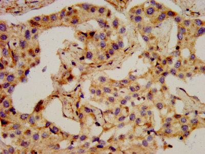IHC image of CSB-PA017642LA01HU diluted at 1:400 and staining in paraffin-embedded human liver cancer performed on a Leica BondTM system. After dewaxing and hydration, antigen retrieval was mediated by high pressure in a citrate buffer (pH 6.0). Section was blocked with 10% normal goat serum 30min at RT. Then primary antibody (1% BSA) was incubated at 4°C overnight. The primary is detected by a biotinylated secondary antibody and visualized using an HRP conjugated SP system.