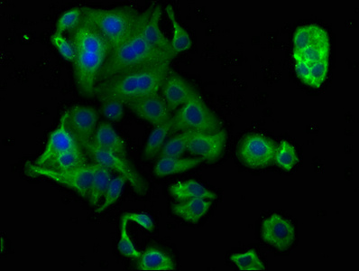 Immunofluorescence staining of HepG2 cells with CSB-PA07039A0Rb at 1:100, counter-stained with DAPI. The cells were fixed in 4% formaldehyde, permeabilized using 0.2% Triton X-100 and blocked in 10% normal Goat Serum. The cells were then incubated with the antibody overnight at 4°C. The secondary antibody was Alexa Fluor 488-congugated AffiniPure Goat Anti-Rabbit IgG(H+L).