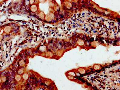 IHC image of CSB-PA861141HA01HU diluted at 1:800 and staining in paraffin-embedded human small intestine tissue performed on a Leica BondTM system. After dewaxing and hydration, antigen retrieval was mediated by high pressure in a citrate buffer (pH 6.0). Section was blocked with 10% normal goat serum 30min at RT. Then primary antibody (1% BSA) was incubated at 4°C overnight. The primary is detected by a biotinylated secondary antibody and visualized using an HRP conjugated SP system.