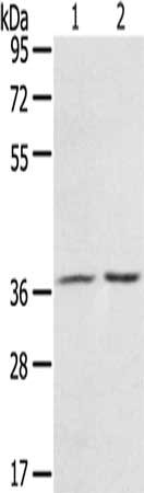 Gel: 8%SDS-PAGE, Lysate: 40 μg, Lane 1-2: Mouse stomach tissue, A431 cells, Primary antibody: CSB-PA202328(PDLIM4 Antibody) at dilution 1/800, Secondary antibody: Goat anti rabbit IgG at 1/8000 dilution, Exposure time: 3 seconds