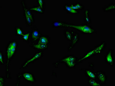 Immunofluorescent analysis of Hela cells using CSB-PA017821LA01HU at dilution of 1:100 and Alexa Fluor 488-congugated AffiniPure Goat Anti-Rabbit IgG(H+L)