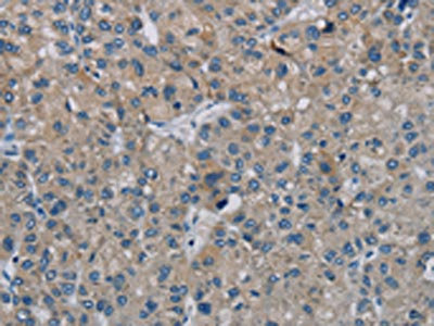 The image on the left is immunohistochemistry of paraffin-embedded Human liver cancer tissue using CSB-PA941646(PHKG2 Antibody) at dilution 1/20, on the right is treated with synthetic peptide. (Original magnification: ×200)