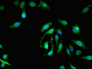 Immunofluorescent analysis of Hela cells using CSB-PA017965LA01HU at dilution of 1:100 and Alexa Fluor 488-congugated AffiniPure Goat Anti-Rabbit IgG(H+L)
