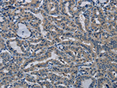 The image on the left is immunohistochemistry of paraffin-embedded Human thyroid cancer tissue using CSB-PA110424(PIK3CB Antibody) at dilution 1/50, on the right is treated with synthetic peptide. (Original magnification: ×200)