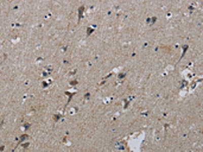 The image on the left is immunohistochemistry of paraffin-embedded Human brain tissue using CSB-PA110424(PIK3CB Antibody) at dilution 1/50, on the right is treated with synthetic peptide. (Original magnification: ×200)