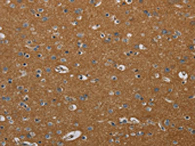 The image on the left is immunohistochemistry of paraffin-embedded Human brain tissue using CSB-PA597940(PIK3CD Antibody) at dilution 1/20, on the right is treated with synthetic peptide. (Original magnification: ×200)