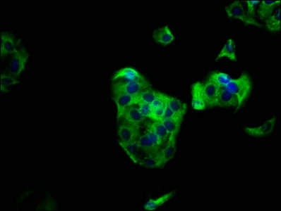 Immunofluorescence staining of HepG2 cells with CSB-PA719469LA01HU at 1:133, counter-stained with DAPI. The cells were fixed in 4% formaldehyde, permeabilized using 0.2% Triton X-100 and blocked in 10% normal Goat Serum. The cells were then incubated with the antibody overnight at 4°C. The secondary antibody was Alexa Fluor 488-congugated AffiniPure Goat Anti-Rabbit IgG(H+L).