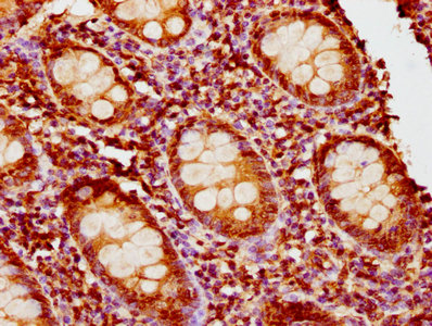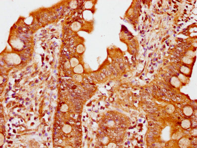 IHC image of CSB-PA719469LA01HU diluted at 1:400 and staining in paraffin-embedded human small intestine tissue performed on a Leica BondTM system. After dewaxing and hydration, antigen retrieval was mediated by high pressure in a citrate buffer (pH 6.0). Section was blocked with 10% normal goat serum 30min at RT. Then primary antibody (1% BSA) was incubated at 4°C overnight. The primary is detected by a biotinylated secondary antibody and visualized using an HRP conjugated SP system.