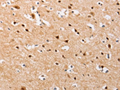 The image on the left is immunohistochemistry of paraffin-embedded Human brain tissue using CSB-PA094535(PIP5K1A Antibody) at dilution 1/30, on the right is treated with fusion protein. (Original magnification: ×200)