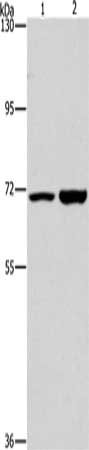 Gel: 6%SDS-PAGE, Lysate: 40 μg, Lane 1-2: PC3 cells, 293T cells, Primary antibody: CSB-PA094535(PIP5K1A Antibody) at dilution 1/300, Secondary antibody: Goat anti rabbit IgG at 1/8000 dilution, Exposure time: 40 seconds