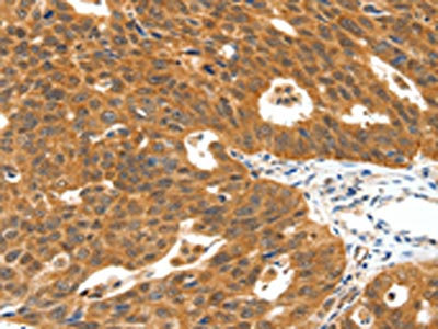 The image on the left is immunohistochemistry of paraffin-embedded Human ovarian cancer tissue using CSB-PA255864(PLAT Antibody) at dilution 1/40, on the right is treated with synthetic peptide. (Original magnification: ×200)