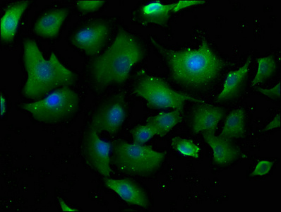 Immunofluorescence staining of U251 cells with CSB-PA018134LA01HU at 1:100, counter-stained with DAPI. The cells were fixed in 4% formaldehyde, permeabilized using 0.2% Triton X-100 and blocked in 10% normal Goat Serum. The cells were then incubated with the antibody overnight at 4°C. The secondary antibody was Alexa Fluor 488-congugated AffiniPure Goat Anti-Rabbit IgG(H+L).