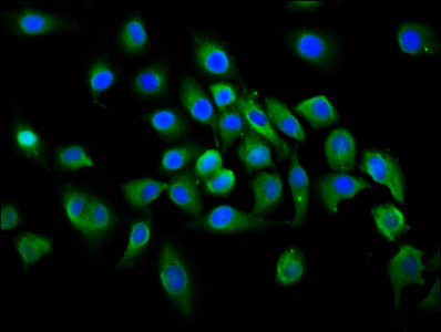 Immunofluorescence staining of A549 cells with CSB-PA624015LA01HU at 1:100, counter-stained with DAPI. The cells were fixed in 4% formaldehyde, permeabilized using 0.2% Triton X-100 and blocked in 10% normal Goat Serum. The cells were then incubated with the antibody overnight at 4°C. The secondary antibody was Alexa Fluor 488-congugated AffiniPure Goat Anti-Rabbit IgG(H+L).