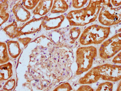 IHC image of CSB-PA624015LA01HU diluted at 1:300 and staining in paraffin-embedded human kidney tissue performed on a Leica BondTM system. After dewaxing and hydration, antigen retrieval was mediated by high pressure in a citrate buffer (pH 6.0). Section was blocked with 10% normal goat serum 30min at RT. Then primary antibody (1% BSA) was incubated at 4°C overnight. The primary is detected by a biotinylated secondary antibody and visualized using an HRP conjugated SP system.