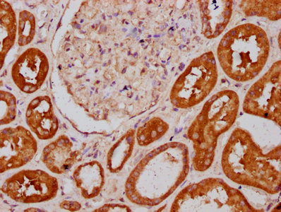 IHC image of CSB-PA623928LA01HU diluted at 1:400 and staining in paraffin-embedded human kidney tissue performed on a Leica BondTM system. After dewaxing and hydration, antigen retrieval was mediated by high pressure in a citrate buffer (pH 6.0). Section was blocked with 10% normal goat serum 30min at RT. Then primary antibody (1% BSA) was incubated at 4°C overnight. The primary is detected by a biotinylated secondary antibody and visualized using an HRP conjugated SP system.