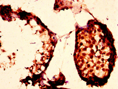 IHC image of CSB-PA018212EA01HU diluted at 1:200 and staining in paraffin-embedded human testis tissue performed on a Leica BondTM system. After dewaxing and hydration, antigen retrieval was mediated by high pressure in a citrate buffer (pH 6.0). Section was blocked with 10% normal goat serum 30min at RT. Then primary antibody (1% BSA) was incubated at 4°C overnight. The primary is detected by a biotinylated secondary antibody and visualized using an HRP conjugated SP system.