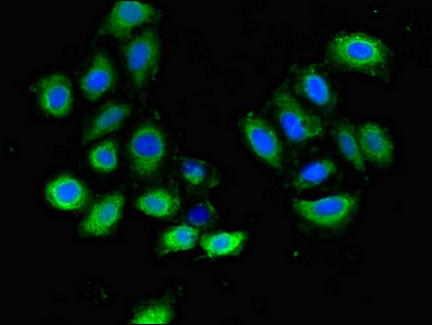 Immunofluorescent analysis of A549 cells using CSB-PA659725LA01HU at dilution of 1:100 and Alexa Fluor 488-congugated AffiniPure Goat Anti-Rabbit IgG(H+L)