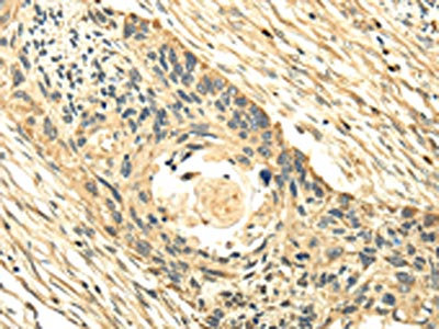The image on the left is immunohistochemistry of paraffin-embedded Human esophagus cancer tissue using CSB-PA094064(PMP2 Antibody) at dilution 1/25, on the right is treated with fusion protein. (Original magnification: ×200)
