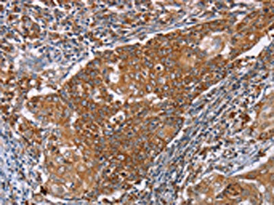 The image on the left is immunohistochemistry of paraffin-embedded Human cervical cancer tissue using CSB-PA280859(PMPCB Antibody) at dilution 1/50, on the right is treated with fusion protein. (Original magnification: ×200)