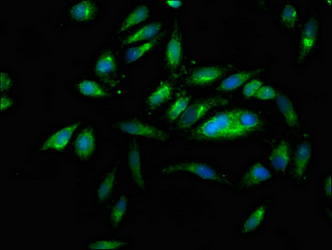 Immunofluorescence staining of Hela cells with CSB-PA809011LA01HU at 1:166, counter-stained with DAPI. The cells were fixed in 4% formaldehyde, permeabilized using 0.2% Triton X-100 and blocked in 10% normal Goat Serum. The cells were then incubated with the antibody overnight at 4°C. The secondary antibody was Alexa Fluor 488-congugated AffiniPure Goat Anti-Rabbit IgG(H+L).