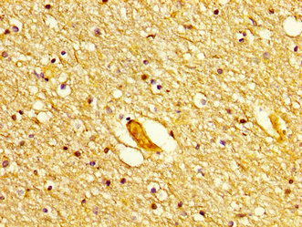 IHC image of CSB-PA018303LA01HU diluted at 1:300 and staining in paraffin-embedded human brain tissue performed on a Leica BondTM system. After dewaxing and hydration, antigen retrieval was mediated by high pressure in a citrate buffer (pH 6.0). Section was blocked with 10% normal goat serum 30min at RT. Then primary antibody (1% BSA) was incubated at 4°C overnight. The primary is detected by a biotinylated secondary antibody and visualized using an HRP conjugated SP system.