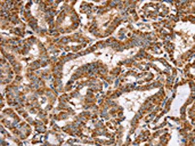 The image on the left is immunohistochemistry of paraffin-embedded Human thyroid cancer tissue using CSB-PA121495(PPOX Antibody) at dilution 1/40, on the right is treated with synthetic peptide. (Original magnification: ×200)